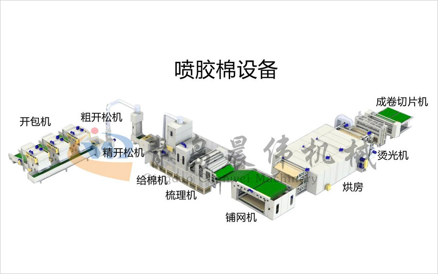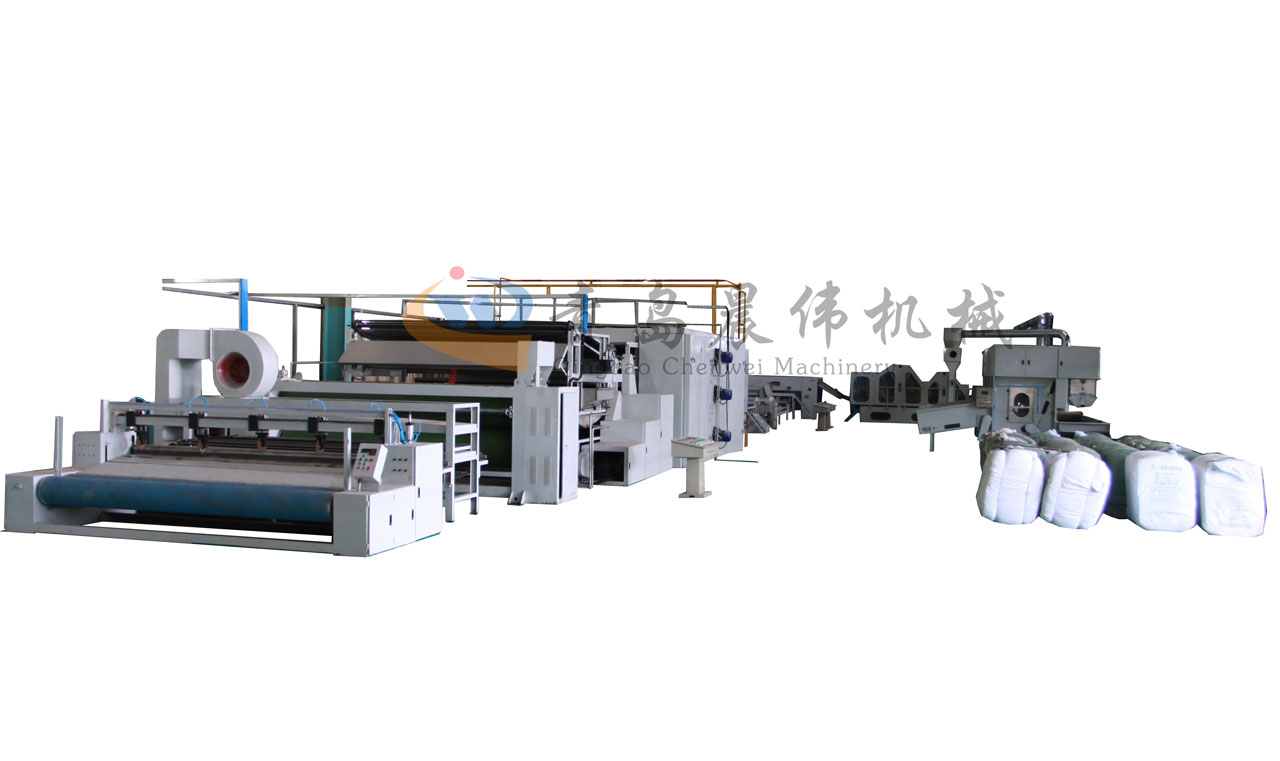開包機(jī)-開松機(jī)-振動(dòng)給棉機(jī)-梳理機(jī)-鋪網(wǎng)機(jī)-烘房-燙光機(jī)-成卷切片機(jī)